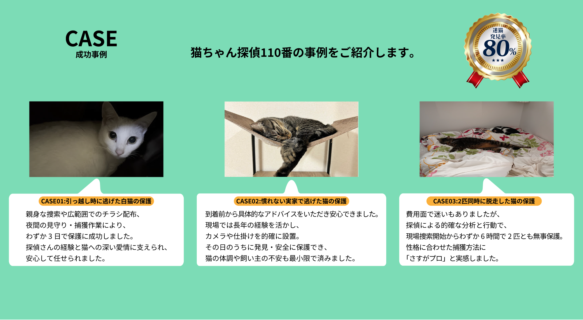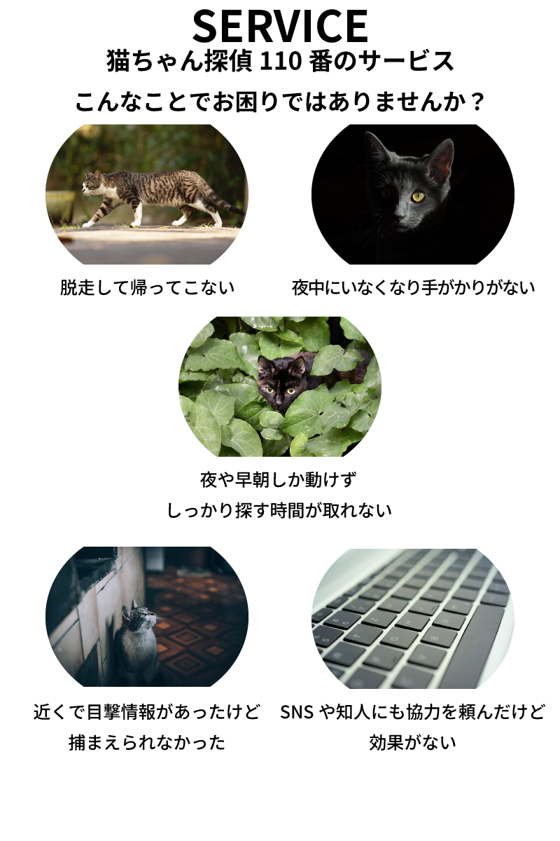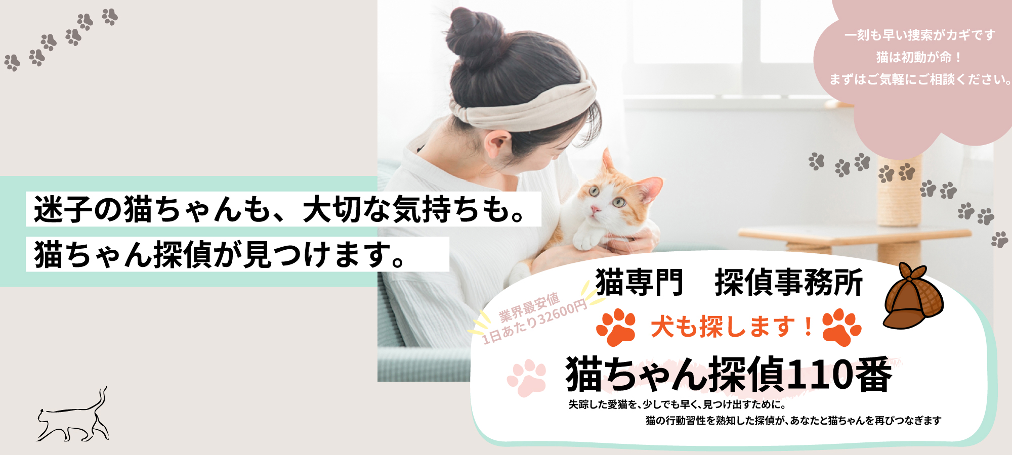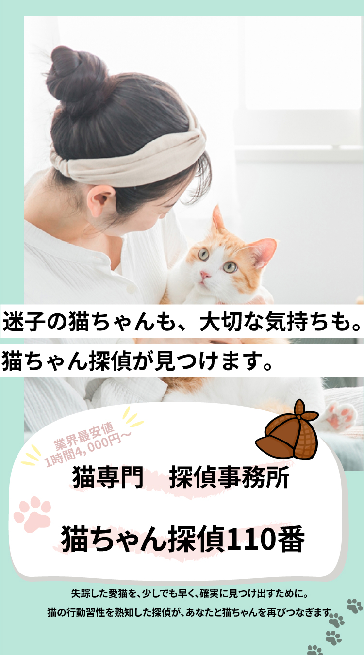 猫の行動習性を熟知した探偵が、あなたと猫ちゃんを再びつなぎます。