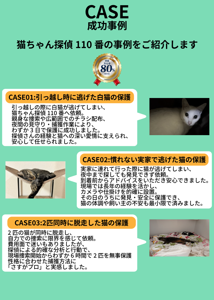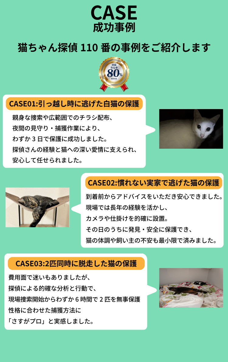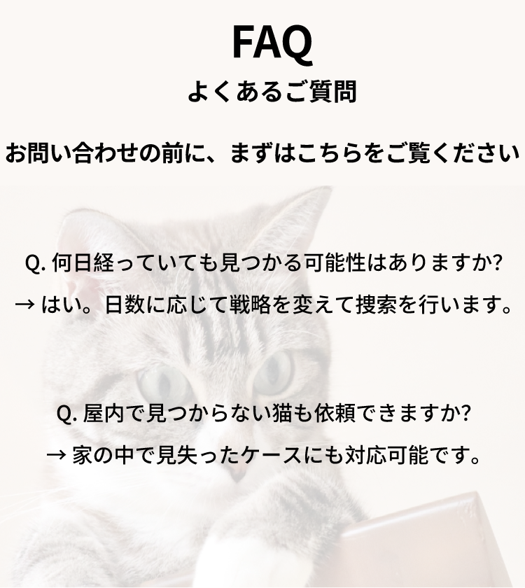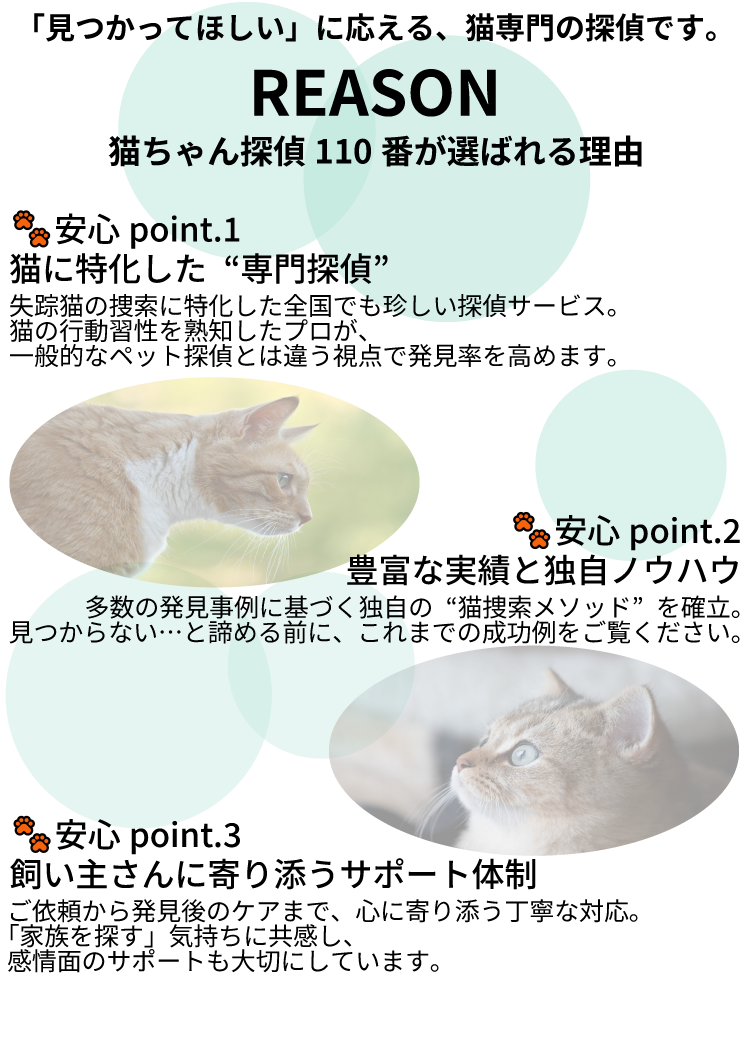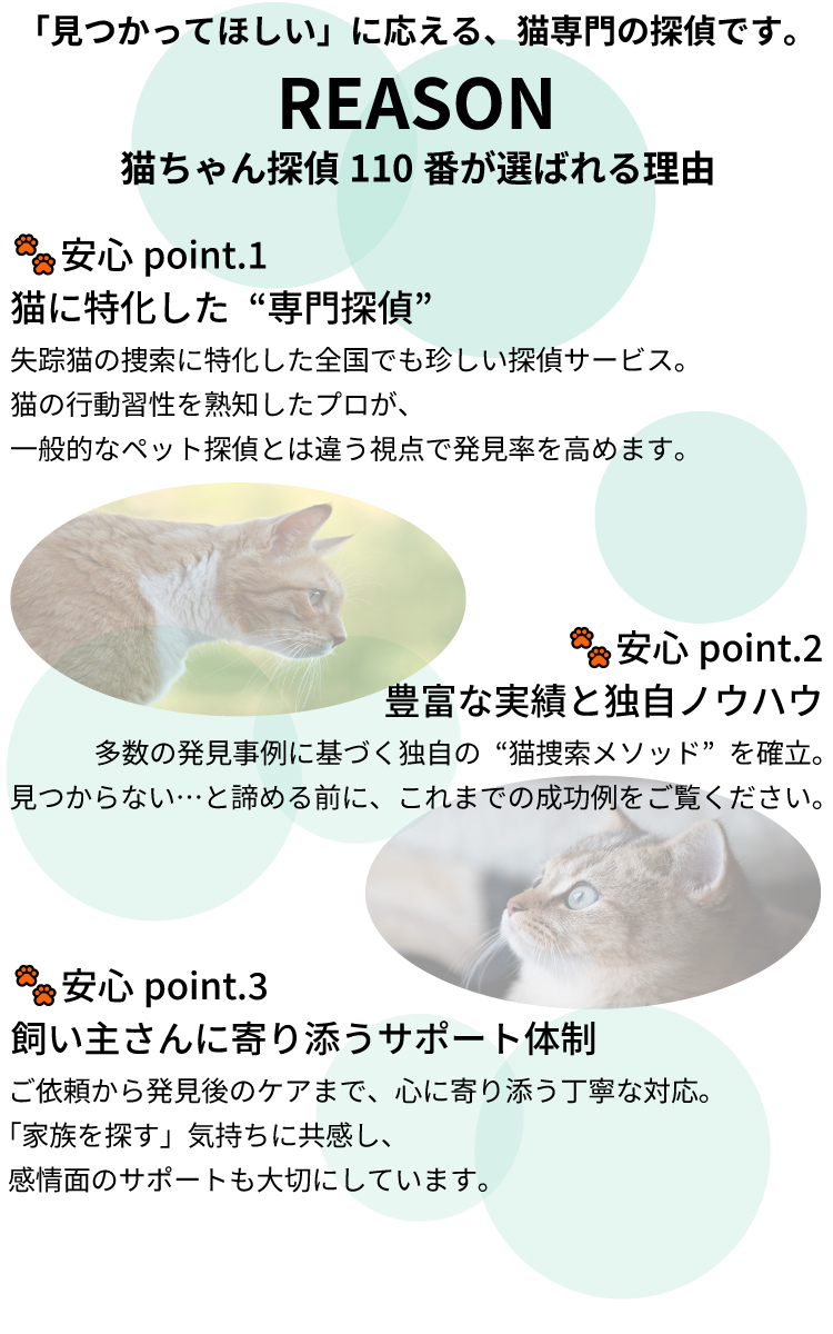 猫の行動習性を熟知した探偵が、あなたと猫ちゃんを再びつなぎます。