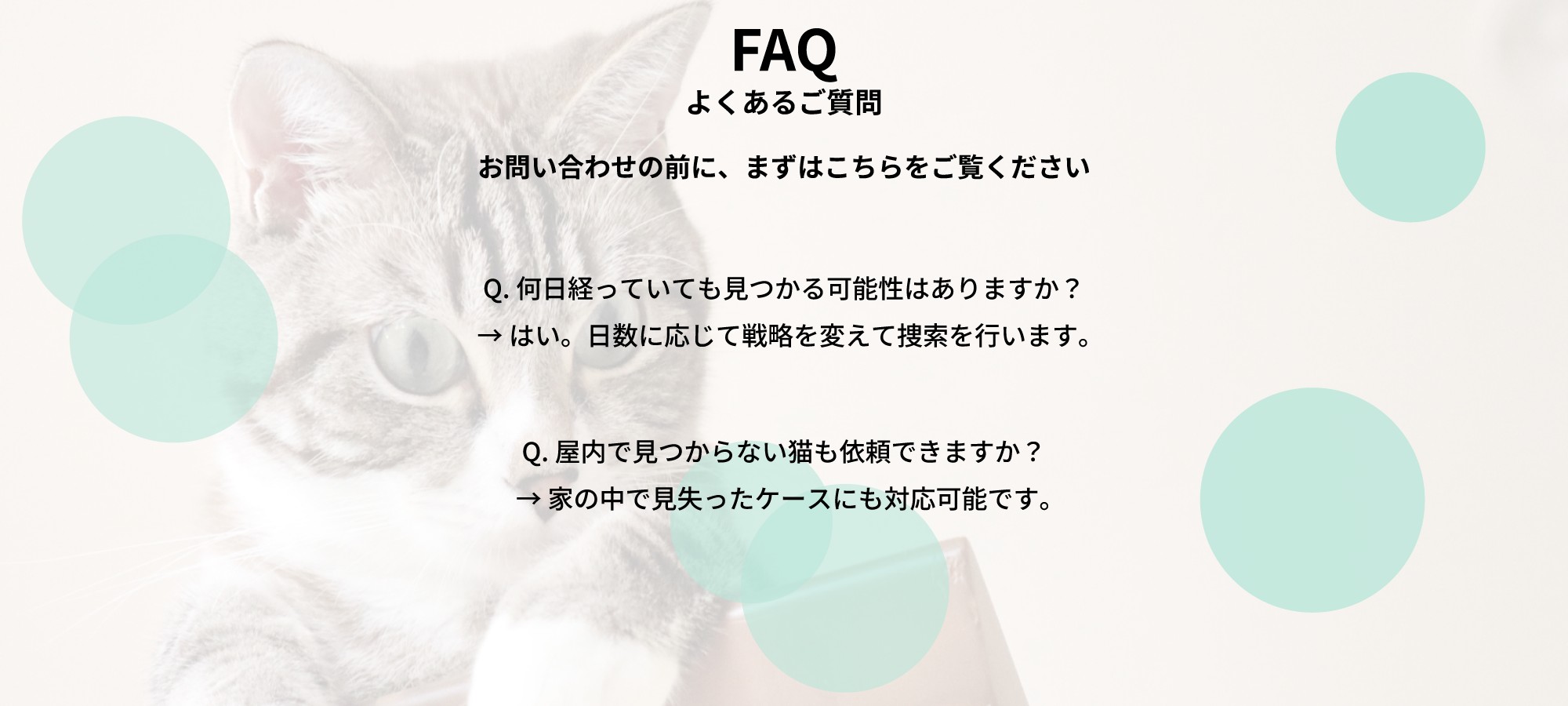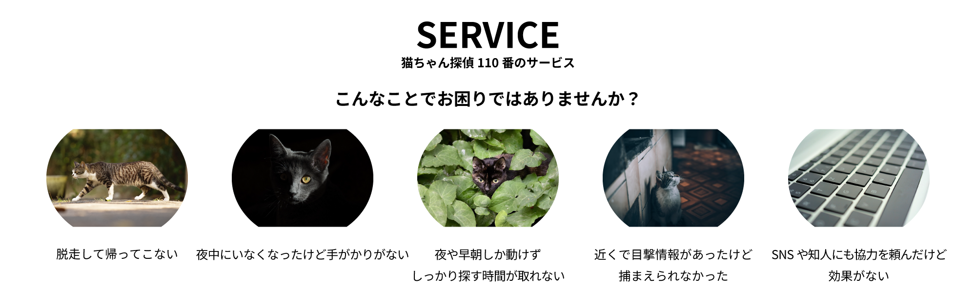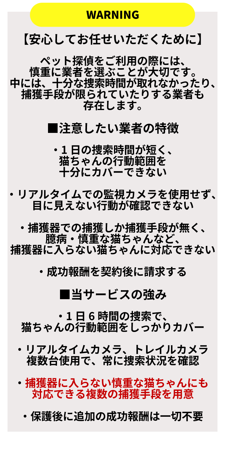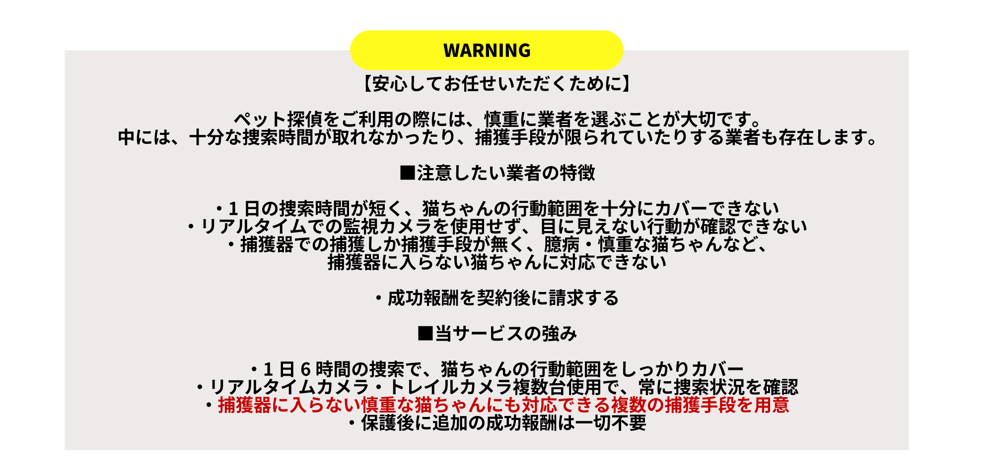 猫の行動習性を熟知した探偵が、あなたと猫ちゃんを再びつなぎます。