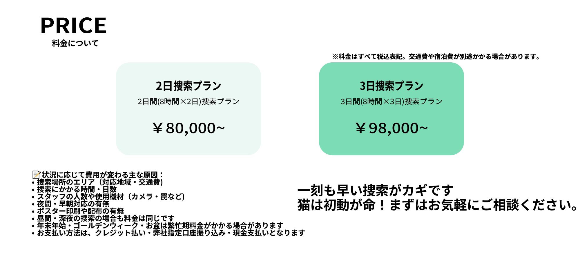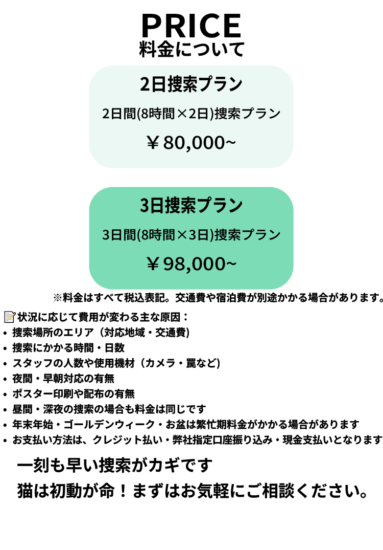 - 昼間・深夜の捜索の場合も料金は同じです