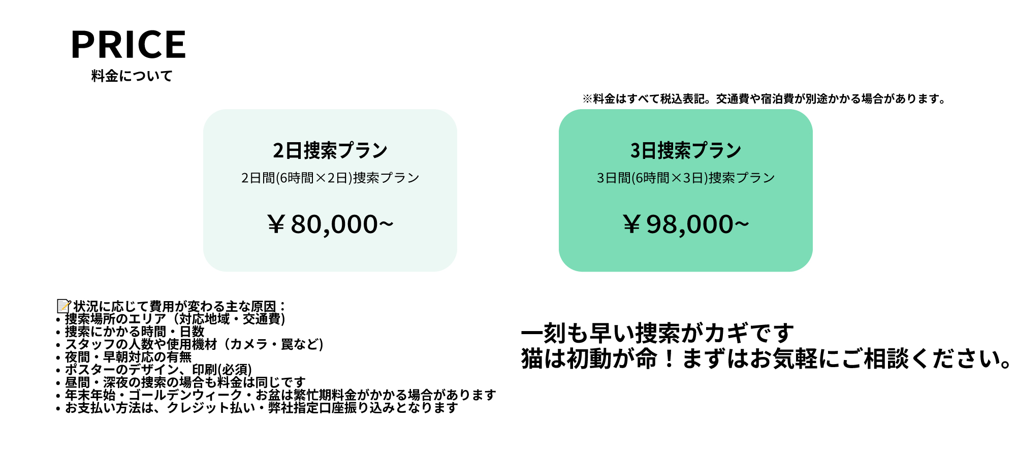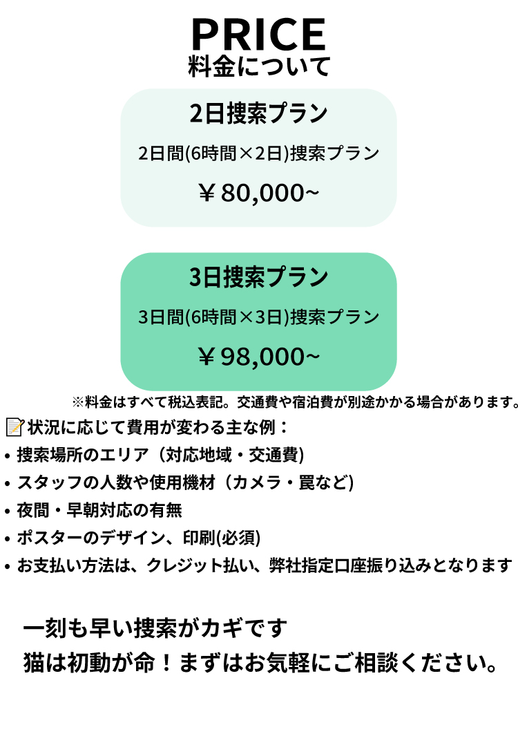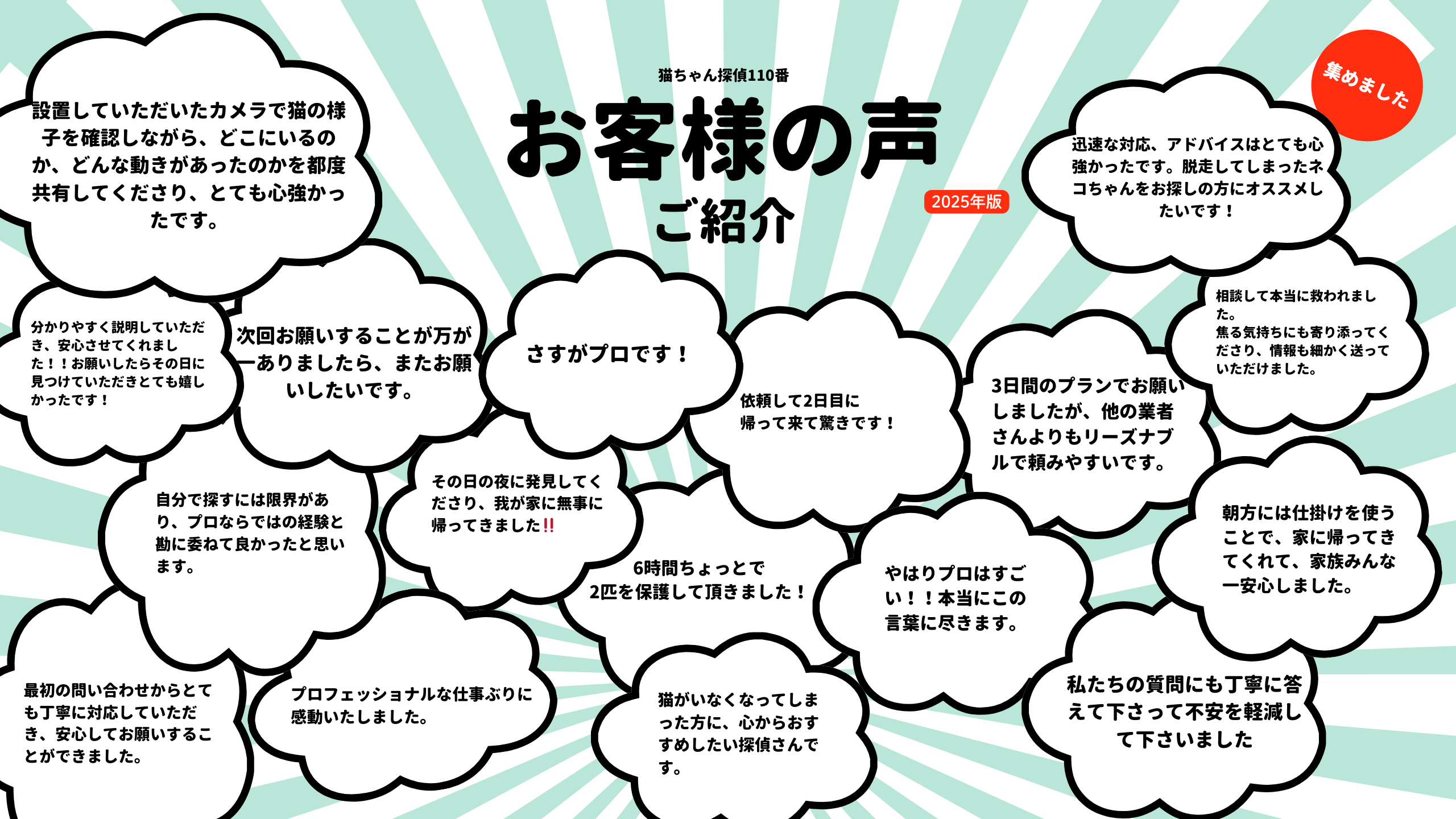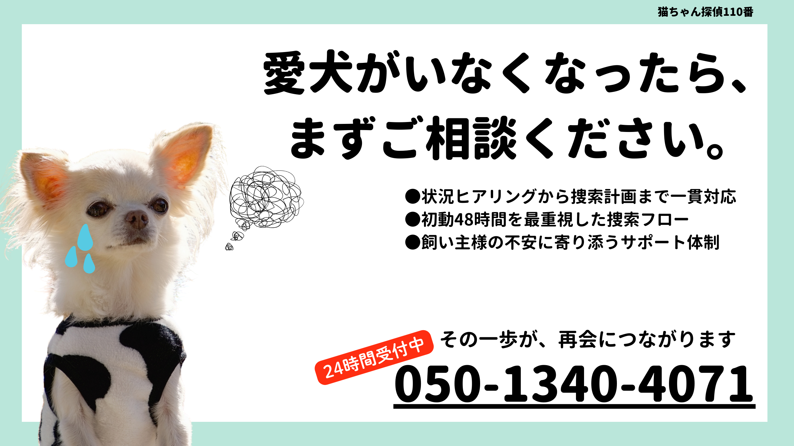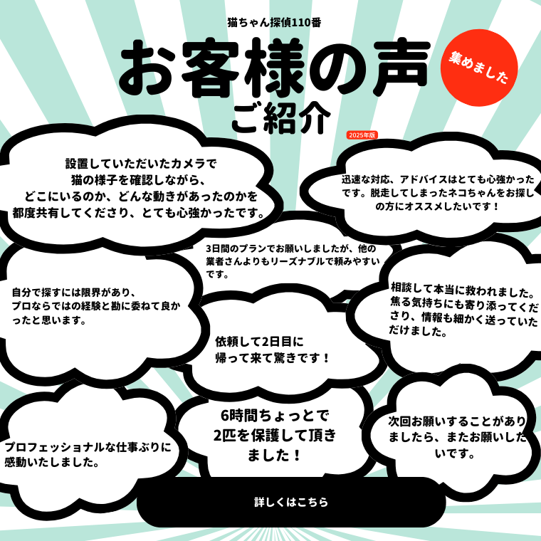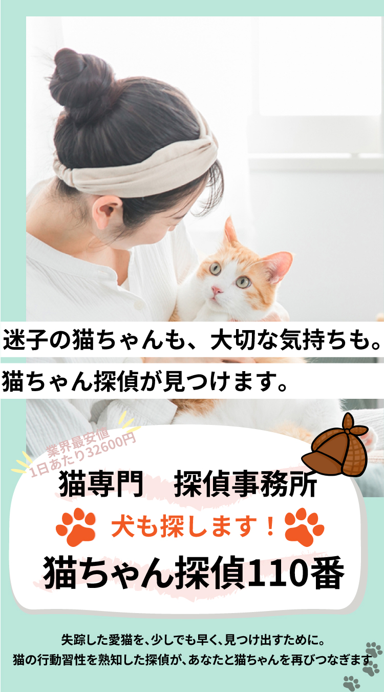 - 2025.10.22お知らせ【お知らせ】猫ちゃん専門ペット探偵事務所(猫ちゃん探偵110番)公式サイトを公開しました
